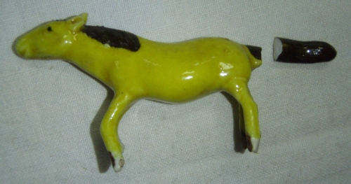 Kůň z keramiky, žlutá barva s tmavě hnědou hřívou a kopyty, odlomen ocas, Čína
